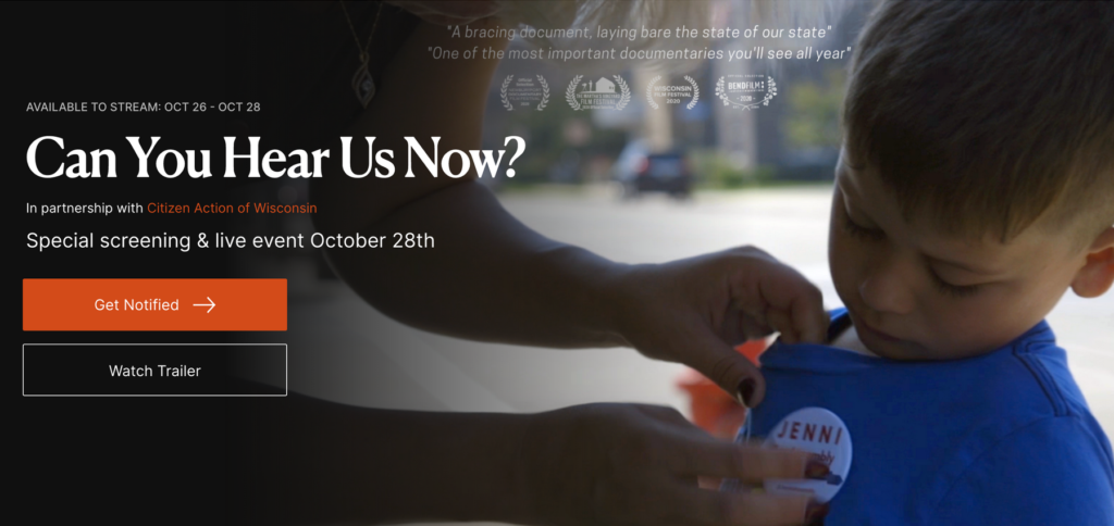 Join Citizen Action of Wisconsin for a very special online screening of the documentary film, “Can You Hear Us Now?” on Wednesday, October 28th at 6pm. The film unravels the ways that years of one-party rule have reshaped democracy in a state once known for its progressive history.