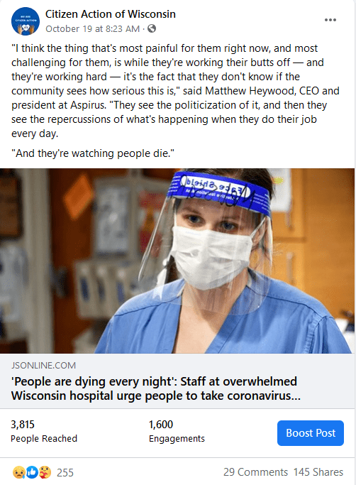 Hopefully on November 7th we know that Trump’s reign of terror over American will be coming to an end. Hopefully by then Joe Biden is President elect and strong progressive candidates have won their seats. Citizen Action of Wisconsin, SEIU Healthcare and Opportunity Wisconsin will once again be bringing activists together to remind them that the fight is never over! We all have our issues that we fight for and we need to stay active and keep on fighting for action on climate change, racial justice in our state, police reform, a living wage, economic justice, healthcare for all, COVID relief, and everything else that will ensure a better tomorrow! Just because we win an election that does not mean we can get lazy. In order to create the world we want to stay we have to stay active and keep organizing!