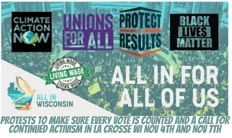 November 7th “All in Wisconsin: Keep Fighting for a Better Tomorrow” rally and protest Copeland Park La Crosse 1:00 PM (?)