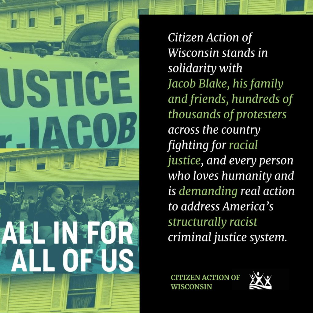 Citizen Action of Wisconsin stands in solidarity with Jacob Blake, his family and friends, hundreds of thousands of protesters across the country fighting for racial justice, and every person who loves humanity and is demanding real action to address America’s structurally racist criminal justice system.