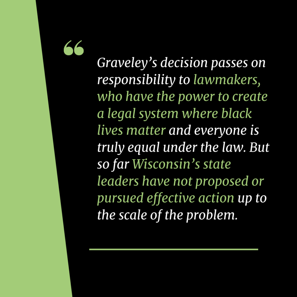 Graveley’s decision also passes on responsibility to lawmakers, who have the power to create a legal system where black lives matter and everyone is truly equal under the law. But so far Wisconsin’s state leaders have not proposed or pursued effective action up to the scale of the problem.