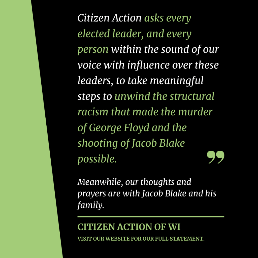 Citizen Action asks every elected leader, and every person within the sound of our voice with influence over these leaders, to take meaningful steps to unwind the structural racism that made the murder of George Floyd and the shooting of Jacob Blake possible. Meanwhile, our thoughts and prayers are with Jacob Blake and his family.