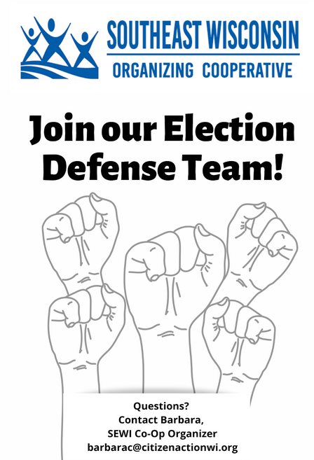 Our voting rights are facing an unprecedented assault from the Republican legislature. Help us fight back! Join the Citizen Action Southeast Organizing Co-op’s new Election Defense Team. We plan to organize a variety of actions that will protect and empower voters in Southeast Wisconsin. We’ll start by getting out the vote in 2022 for our endorsed candidates and recruiting poll workers for the City of Milwaukee, and we’ll expand our scope as we grow. Future actions could include gerrymandering, ranked choice voting, automatic voter registration and more.