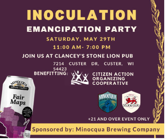 Join the Minocqua Brewing Company and Citizen Action of Wisconsin for a party celebrating vaccination freedom with live music and #ProgressiveBeer. Music featuring Blues Legend John Primer and his Band, The Kim Wasserburger Band, the Tommy Bentz Band, and more…The CDC recently relaxed masking protocols for large outdoor gatherings for anyone who is vaccinated. So proof of vaccination will be required to attend this event. Only folks fully vaccinated plus 2 weeks of full protection will be admitted.