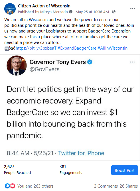 Every Wednesday at 7PM, Dr. Mark Nuemann and Karen Kirsch, the Healthcare Co-op Organizer, explore the various aspects of our healthcare system. They do have a special emphasis on why a single payer system should be the ultimate end goal but in doing so cover other related topics like BadgerCare Expansion and the ACA Supreme Court decision. You can find them on the Citizen Action of Wisconsin Facebook page via Facebook Live or register to watch them directly in Zoom.