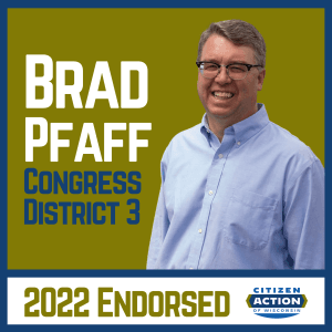 The CD 3 interview committee included members from Citizen Action’s Driftless, North Central, and Northwest organizing co-ops. The committee overwhelmingly voted to endorse Brad not only due to the serious threat of Jan. 6th insurrectionist Derrick Van Orden but because of Brad’s qualifications.