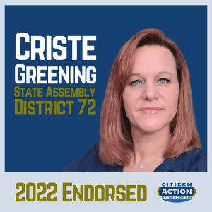 Criste Greening has been endorsed by Citizen Action in previous campaigns. Criste is longtime and well-regarded climate and the environmental activist, particularly for clean water.