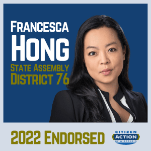 State Representative Francesca Hong’s legislative resume and candidate questionnaire impressed Citizen Action Board. Francesca has a strong voter outreach plan that includes fundraising for other state legislative candidates, as she did not have a primary and does not have a general.