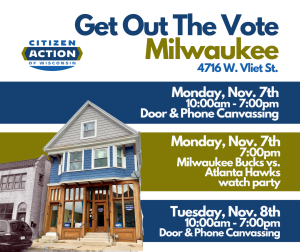 - Green Bay Contact natalie.hoffman@citizenactionwi.org if you can knock doors any time on Tuesday.