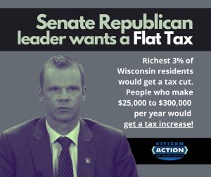 Tuesday, Senate Republican leader Devin LeMahieu called for a flat tax – a terrible idea! A flat tax will cut taxes on the wealthy and raise taxes on most Wisconsin workers. Screw that! We need to increase taxes on the wealthy.