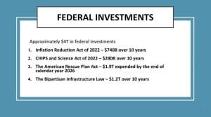 Over the next ten years, roughly $4 trillion will be invested across the country through four federal programs: The American Rescue Plan Act (ARPA), the Infrastructure Investment and Jobs Act (IIJA), and the CHIPS and Science Act (CHIPS) and the Inflation Reduction Act (IRA).