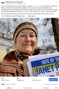 You know it is a critical election when you can get people out to canvass in the bitter cold! Thanks to Indiana, Katherine, Rachel, Karen and Movement Organizing Director of Citizen Actionof WI Kate Felton for bundling up with me last Saturday to canvass. We were out talking to the great folks of Holmen, WI about the importance of this spring election and the long lasting impact it will have on Wisconsinites. We were of course sharing info on Judge Janet but also getting out the word about School Board Candidate Khadijah Islam. Khadijah is a highly qualified candidate that will bring youth, diversity and a fresh new perspective to the Holmen School Board.