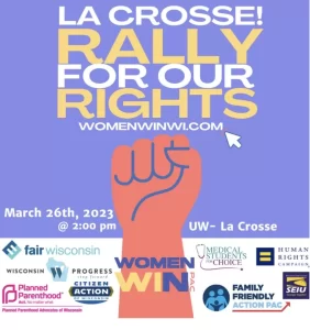 Don’t forget our Fight for Our Rights Rally in La Crosse at UW-L in the Student Union Bluffs Room at 2:00 on Sunday, March 26th! Doors will open at 1:30 and you can find free parking in Lot C or the parking garage near the Student Union. I attended the amazing Eau Claire rally with over 200 people! C’mon La Crosse – the bar has been set. Let’s rally!