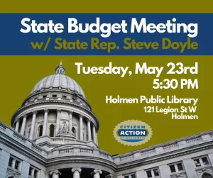 At a Budget listening session on Tuesday at Holman Public Library Rep Steve Doyle (D-Onalaska) and Citizen Action’s Executive Director Robert Kraig will explain the major changes, their impact on La Crosse and the Driftless Area, and what engaged citizen can do to restore vital public priorities to the final state budget.