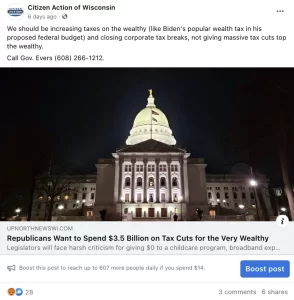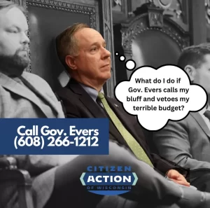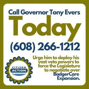 There are many individual citizens and organized groups with active and engaged memberships who stand ready to back Evers up. Citizen Action members have been generating phone calls and postcards to the governor urging him to use his veto to force the issue on BadgerCare expansion. Unlike less salient issues, members of the general public, when asked, are willing to pick up the phone and call the governor on this issue. Last week, 16 advocacy groups and unions, many core Evers allies, signed a letter urging him to use his veto to force BadgerCare expansion back on the table.