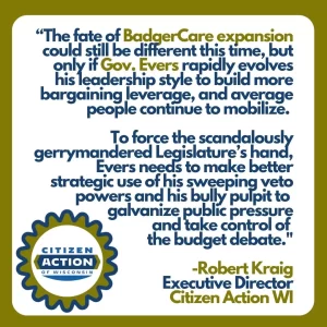 The fate of BadgerCare expansion could still be different this time, but only if Gov. Evers rapidly evolves his leadership style to build more bargaining leverage, and average people continue to mobilize. To force the scandalously gerrymandered Legislature’s hand, Evers needs to make better strategic use of his sweeping veto powers and his bully pulpit to galvanize public pressure and take control of the budget debate.