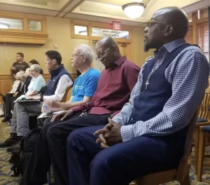 Citizen Action North Side Rising members Keith Holloway and Maurice Smith (two men to the right in photo) attended the Milwaukee Common Council meeting to support the passages of the Milwaukee County Equity Task force legislation. They see this legislation as an opportunity to develop SBE/MBE businesses like theirs.