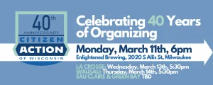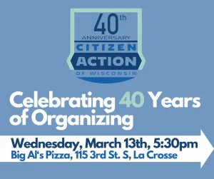 We will also be celebrating in La Crosse, Wednesday, March 13th, 5:30pm at Big Al’s Pizza (contact: Kristie.Tweed@citizenactionwi.org) and Wausau, Thursday, March 14th, 5:30pm at the Labor Temple (contact: Joel.Lewis@citizenaction.org.