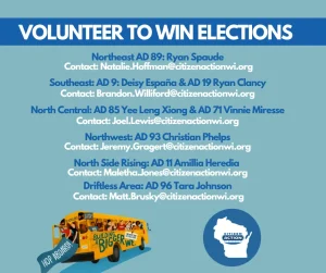 SIGN UP to Volunteer with Citizen Action’s Phone Bank for State Legislative Candidates and against the 2 state constitutional amendment questions, every Tuesday, 5pm.