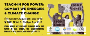 Join Wisconsin Climate Action Group for the “Teach-In for Power: Combat We Energies & Climate Change” on Thursday, August 22, from 5:30 to 8:00 PM at 2821 N Vel R. Phillips Ave #115.