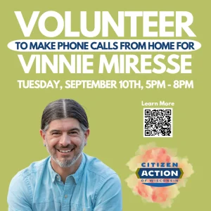 Volunteer to make calls Tuesday, September 10th, 5pm – 7:45pm for Vinnie Miresse, Assembly District 71 in the Stevens Point area.