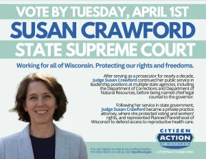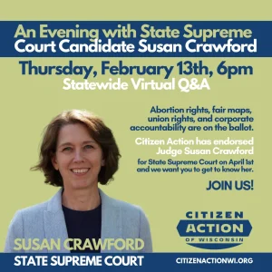 Citizen Action is endorsing Susan Crawford in the pivotal election for control of the Wisconsin Supreme Court. Citizen Action’s board of directors, which includes grassroots members from throughout the state, interviewed Judge Crawford, asked her the hard questions, and voted unanimously to endorse her.