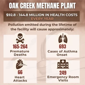 We Energies is proposing two new gas plants in Oak Creek and Paris that would cause serious harm to our communities. A new analysis shows these facilities could result in 351 premature deaths, 93 heart attacks, and $192 million in annual health costs. Children, seniors, and low-income families would be hit the hardest, especially in areas already burdened by toxic air pollution.