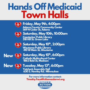 If you want to have a Hands Off Medicaid Town Hall in your community – reach out to me at kristie.tweed@citizenactionwi.org or 608-317-1331.