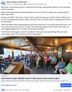 We start with the on-going invasion of many Wisconsin communities by energy and water sucking data centers. While profiting Silicon Valley, Wall Street, and Big Utilities these projects threaten to accelerate runaway climate change and spike already unaffordable utility prices. While state and local economic development boosters, including the Evers Administration, throw public money at data centers without considering the massive environmental costs and limited economic impact, a few brave communities are standing up in places such as Menomonie and Caledonia. We need to refocus public policy on addressing the climate crisis, not economical development boondogles that light the planet on fire. We encourage people to attend this Sunday’s Climate March at the Capitol in Madison at Noon.