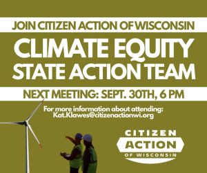 We are building a team that meets regularly to organize, strategize, and win. We need members from every part of Wisconsin. Interested in joining? Email Climate Action Policy Coordinator Kat Klawes at kat.klawes@citizenactionwi.org.