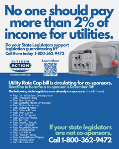 We update the co-sponsor count for the Utility Rate Cap bill, bringing the total of sponsors to 19. We encourage our listeners to contact your state Senators and Representatives next week before the December 5th co-sponsorship deadline.