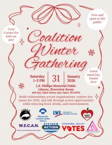 Citizen Action of Wisconsin’s Northwestern Organizing Cooperative is co-hosting the Coalition Winter Gathering in Eau Claire on Saturday, January 31st from 1-3pm at the L.E. Phillips Memorial Public LIbrary (400 Eau Claire St, Eau Claire, WI 54701).