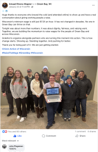 Green Bay area Citizen Action members met last Friday on a frigid night to plan organizing support for a new $20 Wage bill in the state legislature.