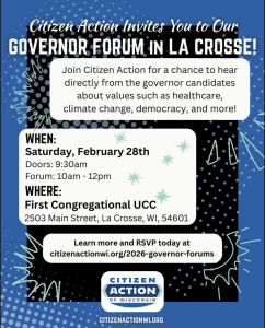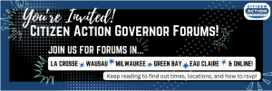 We invite all Battleground Wisconsin listeners to attend Citizen Action’s Governor Forums in La Crosse, Eau Claire, Wausau, Green Bay, and Milwaukee. RSVP for the La Crosse Forum here.