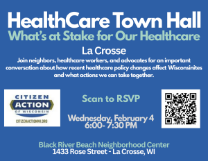 Right now, Medicaid, Medicare, and the Affordable Care Act are under attack, and the cuts will hit Wisconsin families hard. On February 4th, we’re gathering in La Crosse to hear directly from people already feeling the impact and to talk about what we can do about it.