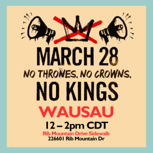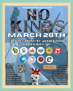 Attend No Kings Green Bay, 3/28, 11:30am. St James Park.