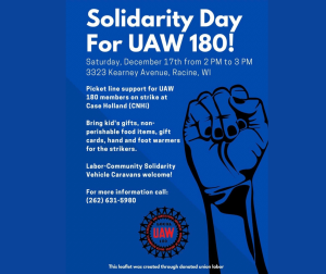 Join UAW Local 180 tomorrow, Saturday, December 17, 3pm, 3323 Kearney Ave, Racine, for a solidarity day to support striking UAW Local 180 workers at Case New Holland (CNHi).
