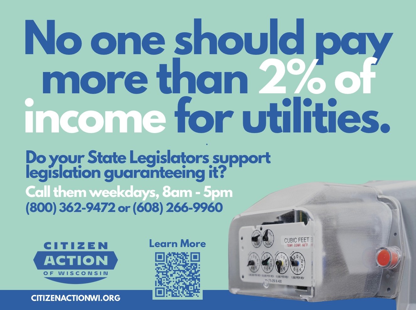 Several states have laws capping the percentage of income people have to pay for utilities. Wisconsin has no limit. Citizen Action members are working with State Representative Darrin Madison on a bill that will cap the percentage of income households must pay for electricity and heat to the affordable level of 2% of income. The bill is a win-win for family budgets and for the environment. Read the text of Assembly Bill 785/Senate Bill 780 here.